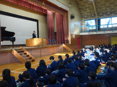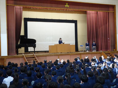 最後に、生徒指導担当から冬休みの生活について、安全面や生活リズム、公共の場でのマナーなどについて話がありました。心身ともに充実した冬休みを過ごし、3学期に元気な姿で再会できることを願っています。