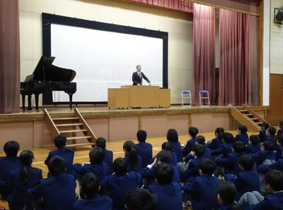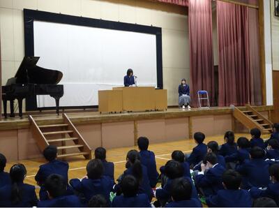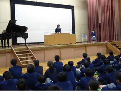 1・2年生による全校朝会を行いました。3年生が卒業し、少し寂しさも感じられる体育館でしたが、在校生一人一人が落ち着いた態度で朝会に臨みました。