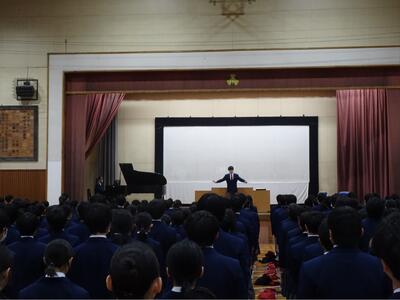 朝会では、校長先生から、この1年間を振り返りながら、日々の授業や学校行事、仲間と協力して過ごした時間の大切さについてお話がありました。また、これまでの学校生活をまとめたスライドショーも上映され、生徒たちはさまざまな場面を懐かしそうに見つめていました。笑顔あふれる行事の様子や、仲間とともに頑張る姿が映し出され、この1年間の成長を改めて感じる時間となりました。年度当初にも伝えられた、「夢」と「希望」をもって毎日を過ごしてほしいというメッセージが改めて送られ、1・2年生には、これまで先輩たちが築いてきた伝統を受け継ぎながら、それぞれの目標に向かって力強く歩んでいってほしいと思います。