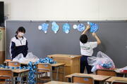 はじめに、入学式で披露する校歌の練習に取り組み、心を一つにして新入生を迎える準備を整えました。その後は、それぞれの役割に分かれ、協力しながら式場づくりを進めました。
