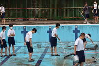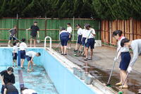少し風が冷たい日でしたが、6月中旬から始まるプールの実施に向け、清掃が始まりました。