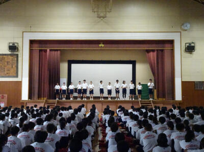 本日、体育館にて生徒朝会が行われ、新人体育大会に向けた壮行会が行われました。全校生徒が一堂に会し、ステージ上からは各部活動の部長がそれぞれの部の代表として力強い意気込みを述べました。「県大会を目標に頑張ります」「仲間と共に勝利を目指します」などの言葉には、自らの決意とチームへの思いが込められていました。