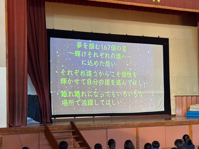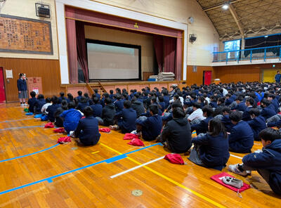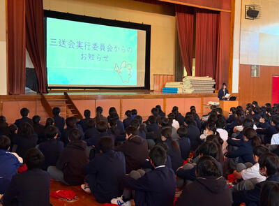 生徒朝会にて、三送会のスローガンが発表されました。スローガンに込めた想いも生徒会本部から話がありました。これから準備もお世話になった3年生のために心を込めて行っていきましょう。