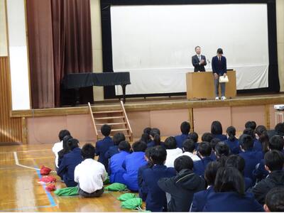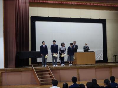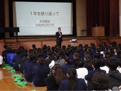 朝会では、校長先生から、この1年間を振り返りながら、日々の授業や学校行事、仲間と協力して過ごした時間の大切さについてお話がありました。また、これまでの学校生活をまとめたスライドショーも上映され、生徒たちはさまざまな場面を懐かしそうに見つめていました。笑顔あふれる行事の様子や、仲間とともに頑張る姿が映し出され、この1年間の成長を改めて感じる時間となりました。年度当初にも伝えられた、「夢」と「希望」をもって毎日を過ごしてほしいというメッセージが改めて送られ、1・2年生には、これまで先輩たちが築いてきた伝統を受け継ぎながら、それぞれの目標に向かって力強く歩んでいってほしいと思います。