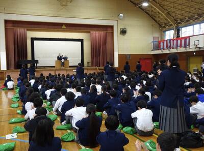 1・2年生による全校朝会を行いました。3年生が卒業し、少し寂しさも感じられる体育館でしたが、在校生一人一人が落ち着いた態度で朝会に臨みました。