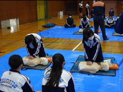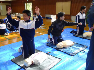 体育館では、消防署職員の方々から実演を交えた説明を受けた後、生徒一人ひとりが訓練用マネキンを使って胸骨圧迫やAED操作を体験しました。初めは緊張した表情を見せていた生徒も、繰り返し練習するうちにリズムよく圧迫を続けられるようになり、仲間同士で声を掛け合いながら真剣に取り組む姿が見られました。