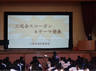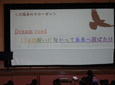 続いて、三年生を送る会(三送会)実行委員会から、今年度のスローガンとテーマの発表が行われました。「Dream road 134の願いに向かって未来へ羽ばたけ」というスローガンには、学年や立場を越えて互いを思い合い、未来へ進んでいこうとする強い思いが込められています。