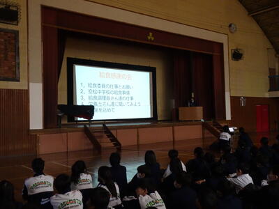 生徒朝会を体育館で実施しました。今回は、給食委員会からの発表を中心に「給食感謝の会」を行い、日頃お世話になっている配膳員さんや栄養士さんの仕事について理解を深める貴重な機会となりました。スライドを用いて、献立作成や食材の発注、調理や衛生管理、アレルギー対応など、私たちの給食が多くの方々の努力によって支えられていることが紹介されました。また、残菜を減らすことの大切さについても呼びかけがあり、日頃の食への感謝の気持ちを行動で表していこうという思いが共有されました。