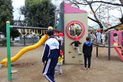 幼児と一緒に園庭を走り回ったり、散歩に出かけたりする中で、生徒は幼児のかわいらし仕草や思いの伝え方に気づき、多くの学びを得ることができました。