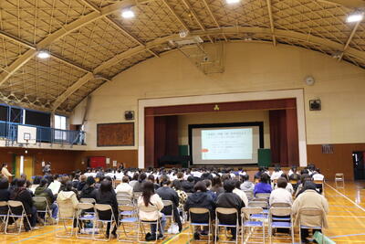 3年生の保護者と生徒を対象とした 進路学習会 を実施しました。あいにくの小雨が降る肌寒い天候にもかかわらず、たいへん多くの保護者の皆さまにご参加いただきました。足を運んでいただき、心より感謝申し上げます。