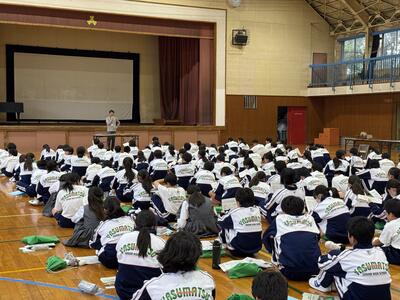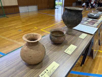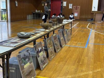 1年生を対象に、所沢市埋蔵文化財調査センターの職員の方々をお招きして講演会を行いました。体育館には、実際に出土した縄文時代や弥生時代の土器・石器などが多数展示され、生徒たちは興味深そうにじっくりと観察していました。講演では、遺跡の発掘作業や出土品の整理・保存の流れ、文化財の大切さについて、写真や実物を交えて分かりやすくお話しいただきました。生徒たちは真剣な表情で話を聞き、配布された資料に熱心にメモを取る姿も見られました。実際の資料に触れることで、歴史が身近に感じられるとても有意義な学習の機会となりました。